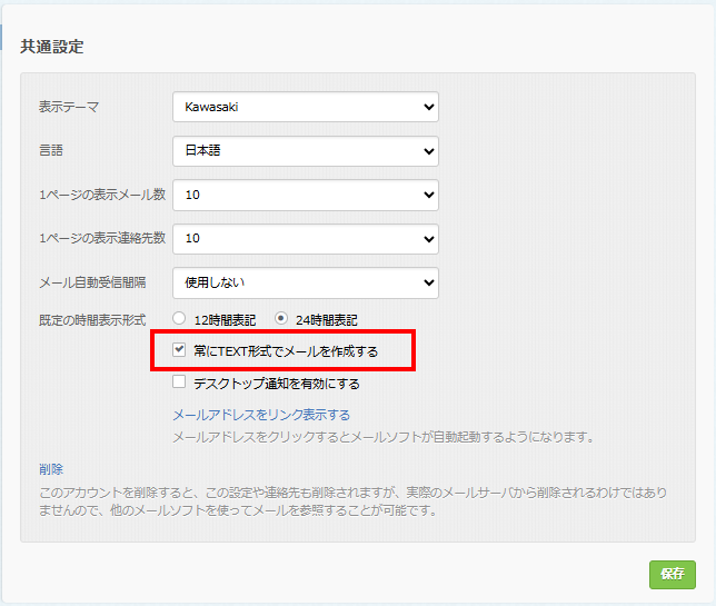 もしくはメールをすべてTEXT形式で作成したい場合、「設定」>「共通」の「常にTEXT形式でメールを作成する」にチェックをしてください。